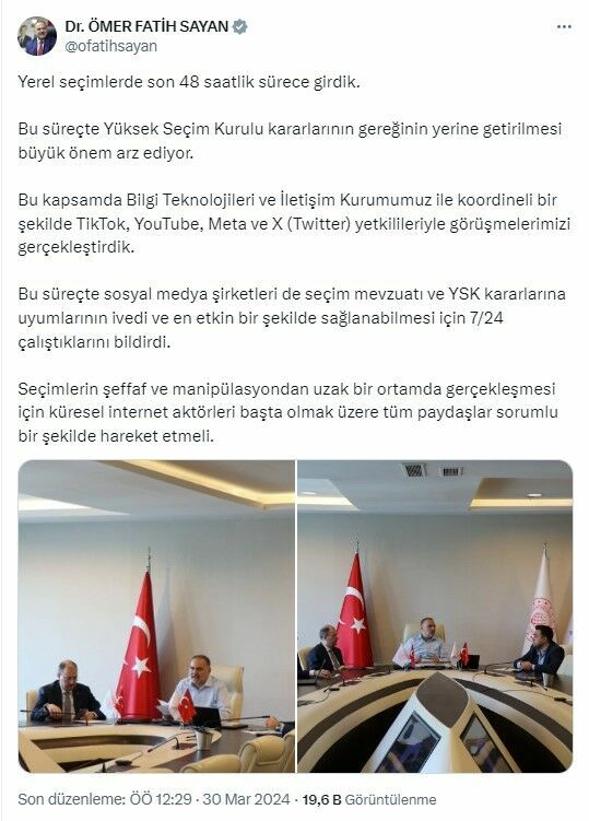 Bakan Yardımcısı Sayan, yaptığı açıklamada, "Yerel seçimlerin son 48 saati içerisindeyiz ve bu süreçte Yüksek Seçim Kurulu kararlarının uygulanması oldukça kritik bir öneme sahiptir. Bu bağlamda, Bilgi Teknolojileri ve İletişim Kurumu ile koordinasyon içinde TikTok, YouTube, Meta ve X (Twitter) temsilcileriyle görüşmelerimizi gerçekleştirdik" dedi.