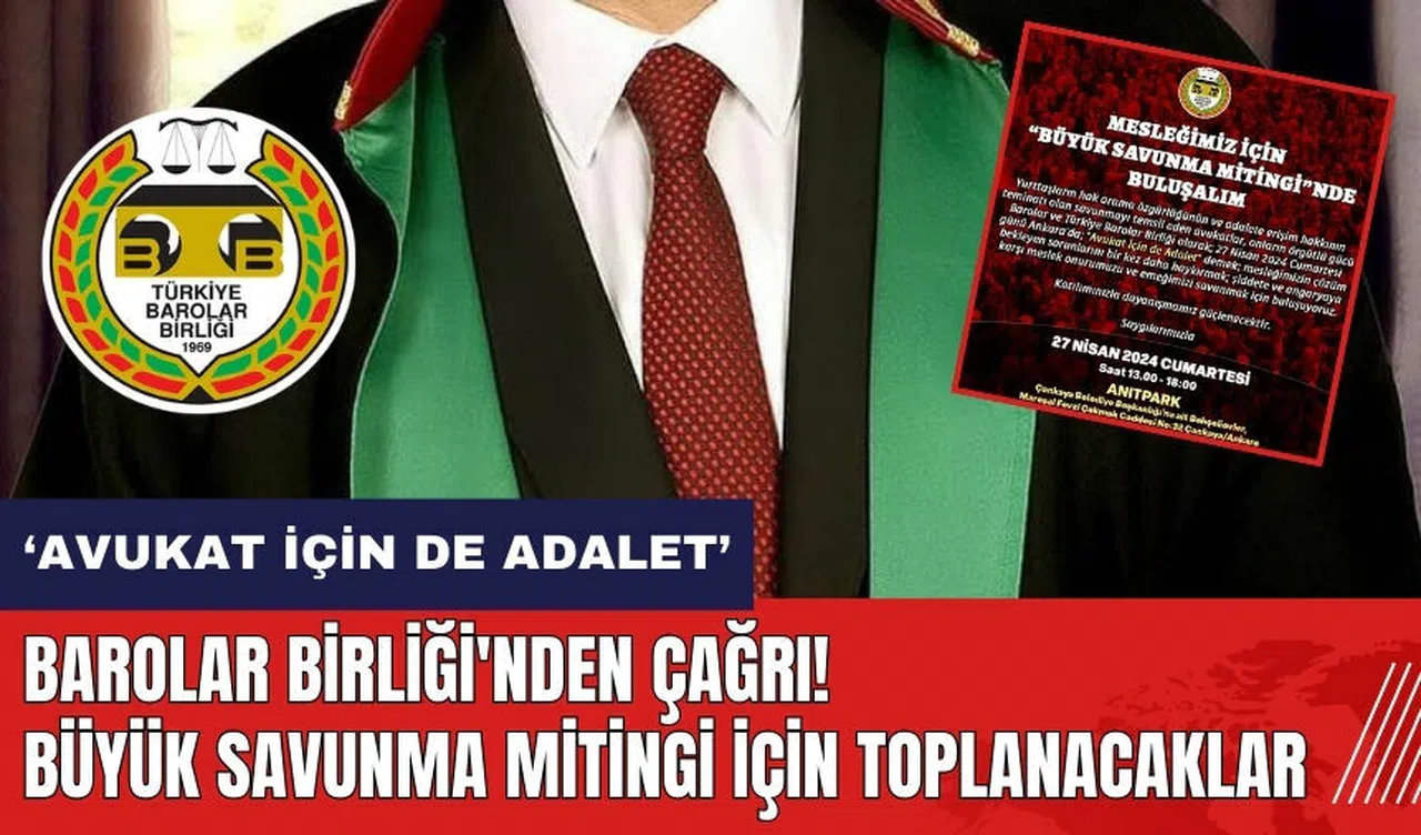 Türkiye Barolar Birliği, mesleğin çzöüm bekleyen sorunlarına dikkat çekmek amacıyla, 'Büyük Savunma Mitingi' çağrısı yapıyor. Yurttaşların hak arama özgürlüğünün ve adalet erişiminin güvencesi olan savunmayı temsil eden avukatlar, 27 Nisan 2024 Cumartesi günü Ankara'da bir araya gelecek.