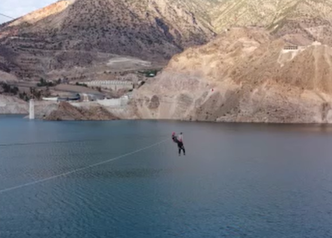 Artvin’in Yusufeli ilçesinde baraj suları altında kalan eski yerleşim yeri üzerinde turizm amaçlı yapılan zipline’ın deneme geçişini Belediye Başkanı Eyüp Aytekin yaptı.