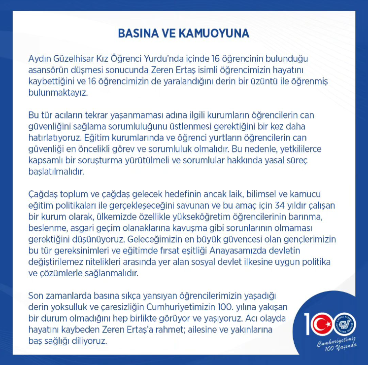 Aydın Güzelhisar Kız Öğrenci Yurdu’nda 16 öğrencinin bulunduğu asansörün düşmesi sonucunda Zeren Ertaş isimli öğrencimizin hayatını kaybettiğini ve 15 öğrencimizin de yaralandığını derin bir üzüntü ile öğrenmiş bulunmaktayız.