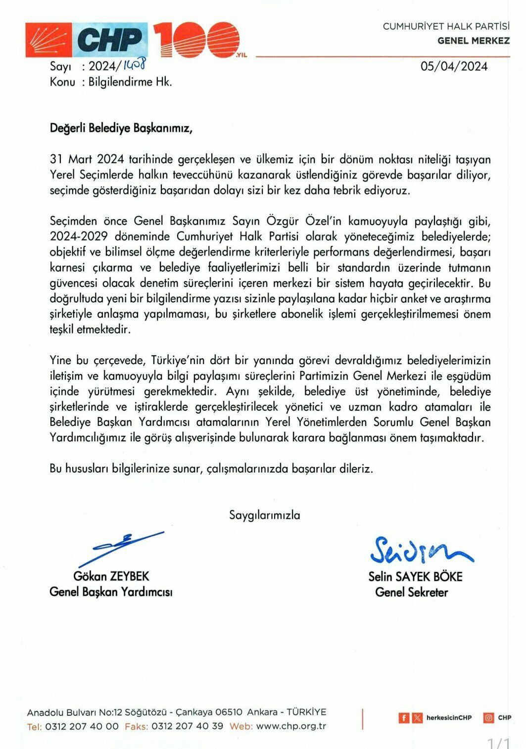 Seçimden önce Genel Başkanımız Sayın Özgür Özel'in kamuoyuyla paylaştığı gibi, 2024-2029 döneminde Cumhuriyet Halk Partisi olarak yöneteceğimiz belediyelerde; objektif ve bilimsel ölçme değerlendirme kriterleriyle performans değerlendirmesi, başarı karnesi çıkarma ve belediye faaliyetlerimizi belli bir standardın üzerinde tutmanın güvencesi olacak denetim süreçlerini içeren merkezi bir sistem hayata geçirilecektir. Bu doğrultuda yeni bir bilgilendirme yazısı sizinle paylaşılana kadar hiçbir anket ve araştırma şirketiyle anlaşma yapılmaması, bu şirketlere abonelik işlemi gerçekleştirilmemesi önem teşkil etmektedir.