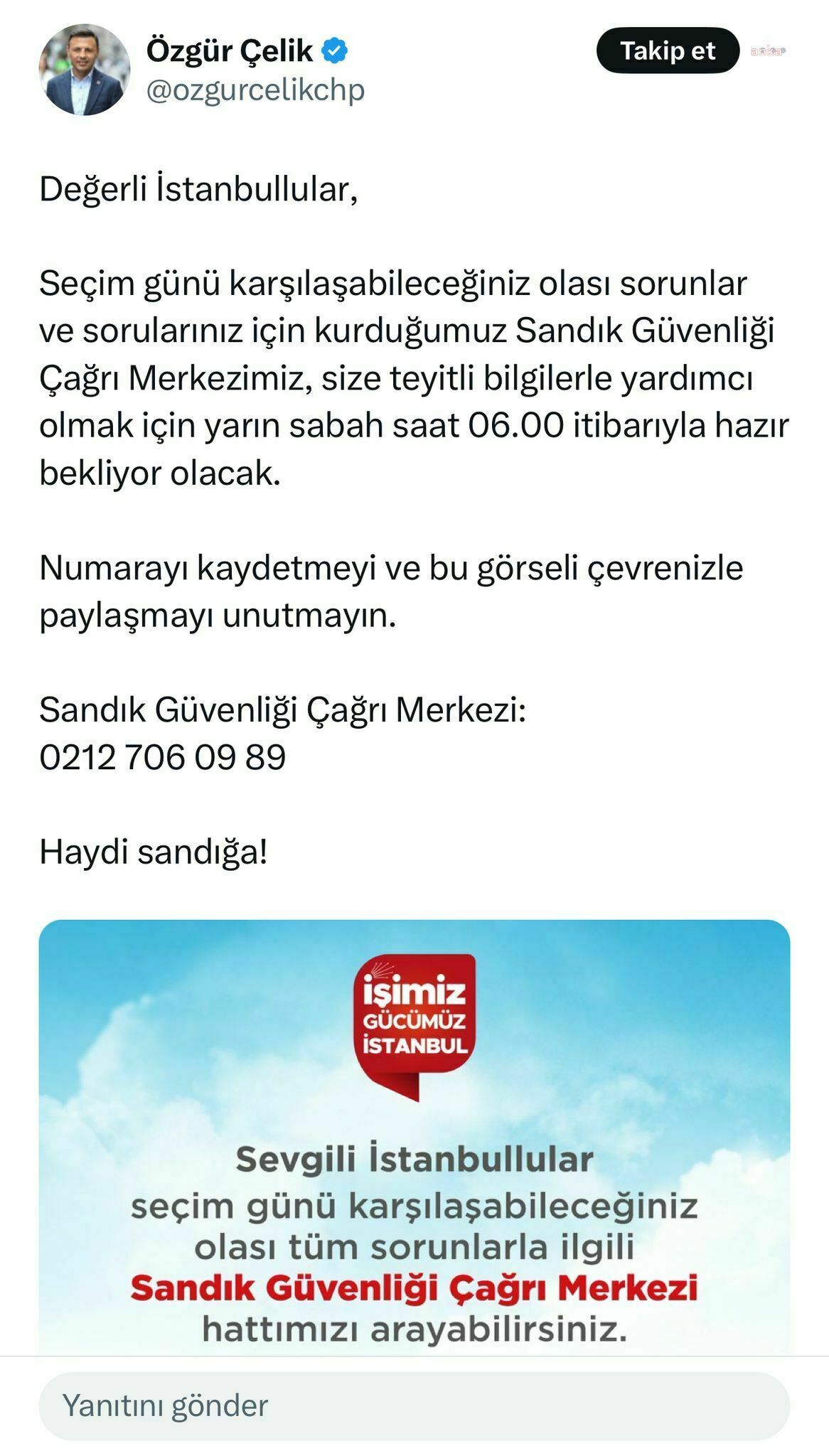 Çelik'in çağrısıyla, İstanbullulara sandığa gitmeleri ve seçim günü karşılaşabilecekleri herhangi bir sorun veya soru için çağrı merkezine başvurmaları isteniyor. Bu sayede, seçmenlerin oy kullanma süreçlerinde herhangi bir aksaklık yaşamamaları amaçlanıyor.