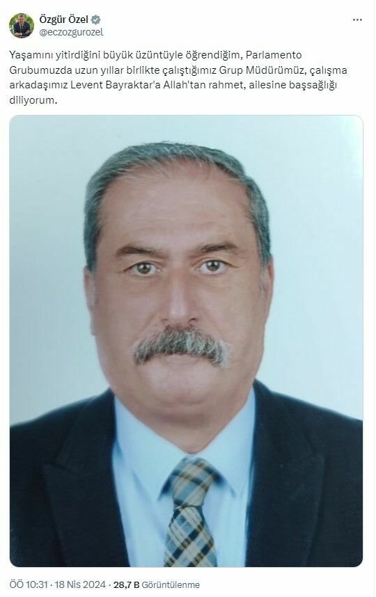 "Parlamento Grubumuzda uzun yıllar birlikte çalıştığımız Grup Müdürümüz ve çalışma arkadaşımız Levent Bayraktar'ın yaşamını yitirdiğini büyük bir üzüntüyle öğrendim. Allah'tan rahmet, ailesine başsağlığı diliyorum."