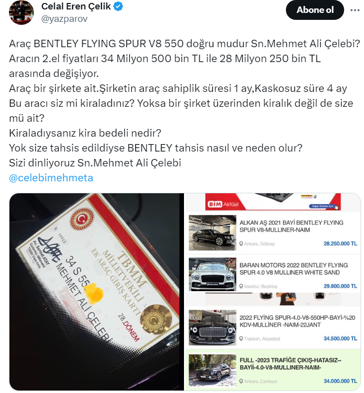 Yazar Celal Eren Çelik, AKP'li Mehmet Ali Çelebi için aracının fiyatı ile ilgili büyük iddialarda bulundu. Bunun üzerine Çelebi'den yanıt gecikmedi.