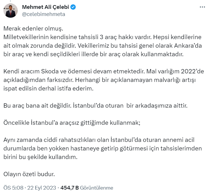 Kendi aracım Skoda ve ödemesi devam etmektedir. Mal varlığım 2022’de açıkladığımdan farksızdır. Herhangi bir açıklanamayan malvarlığı artışı ispat edilsin derhal istifa ederim. Bu araç bana ait değildir. İstanbul’da oturan bir arkadaşımıza aittir. Öncelikle İstanbul’a araçsız gittiğimde kullanmak;Aynı zamanda ciddi rahatsızlıkları olan İstanbul’da oturan annemi acil durumlarda ben yokken hastaneye getirip götürmesi için tahsislerimden birini bu şekilde kullandım.