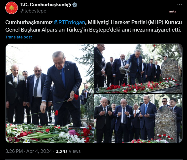 Cumhurbaşkanı Recep Tayyip Erdoğan, vefatının 27'nci yılında MHP'nin Kurucu Genel Başkanı Alparslan Türkeş'in Beştepe'deki kabrini ziyaret etti. Cumhurbaşkanlığı'nın sosyal medya hesabından yapılan paylaşımda, "Cumhurbaşkanımız Recep Tayyip Erdoğan, Milliyetçi Hareket Partisi (MHP) Kurucu Genel Başkanı Alparslan Türkeş'in Beştepe'deki anıt mezarını ziyaret etti" denildi.
