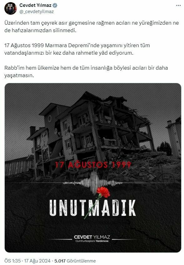 Yılmaz, sosyal medya hesabından yaptığı paylaşımda, "Üzerinden tam çeyrek asır geçmesine rağmen acıları ne yüreğimizden ne de hafızalarımızdan silindi. 17 Ağustos 1999 Marmara Depremi'nde yaşamını yitiren tüm vatandaşlarımızı bir kez daha rahmetle yad ediyorum. Rabb'im hem ülkemize hem de tüm insanlığa böylesi acıları bir daha yaşatmasın." ifadelerini kullandı.