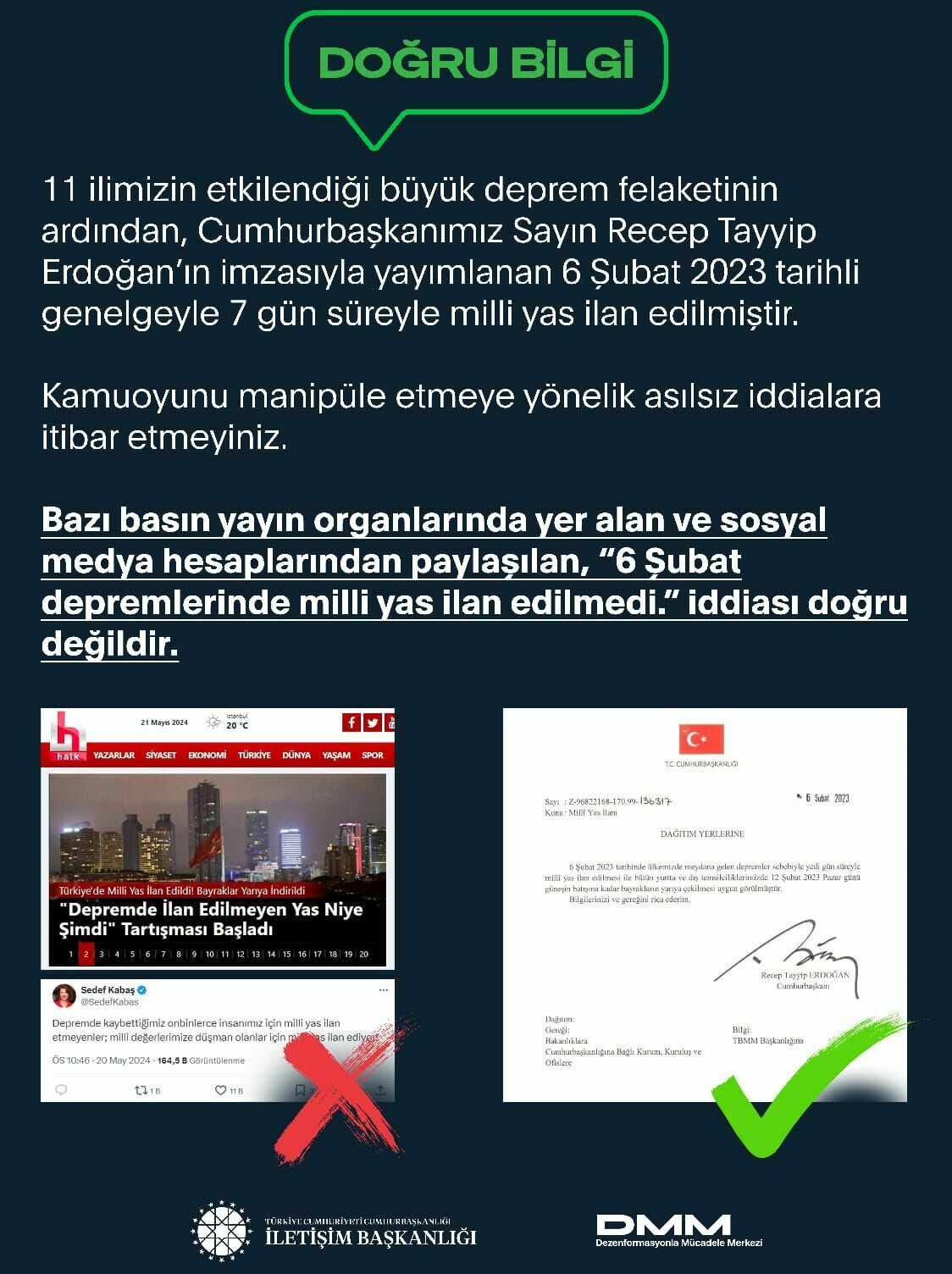'11 ilimizin etkilendiği büyük deprem felaketinin ardından, Cumhurbaşkanı Recep Tayyip Erdoğan’ın imzasıyla yayımlanan 6 Şubat 2023 tarihli genelgeyle 7 gün süreyle millî yas ilan edilmiştir. Kamuoyunu manipüle etmeye yönelik asılsız iddialara itibar etmeyiniz'