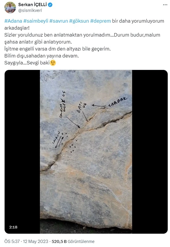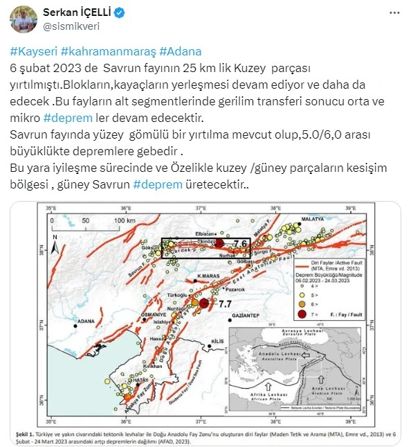 Yer Bilimleri Uzmanı Serkan İçelli, sosyal medya üzerinden Kayseri, Adana ve Kahramanmaraş'ı işaretleyerek, 5 veya 6 büyüklüğünde bir depremin yakın zamanda yaşanabileceğini belirtti. İçelli, mikro ve orta şiddette depremlerin beklenmesi gerektiğini vurgulayarak, fay hatlarının aktivitelerini yakından takip ettiklerini ifade etti.