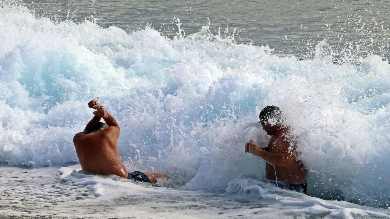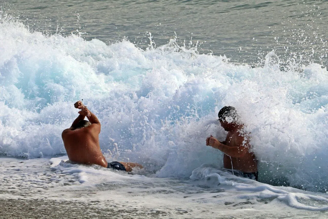 Dalgalardan oluşan köpükle beyaz renge bürünen sahilde, İsveçli iki turistin dalgalar arasındaki eğlencesi, görenleri hem şaşırttı hem tebessüm ettirdi. Sahile vuran dev dalgalara karşı direnmeye çalışan ikili, zaman zaman dengelerini kaybetti.