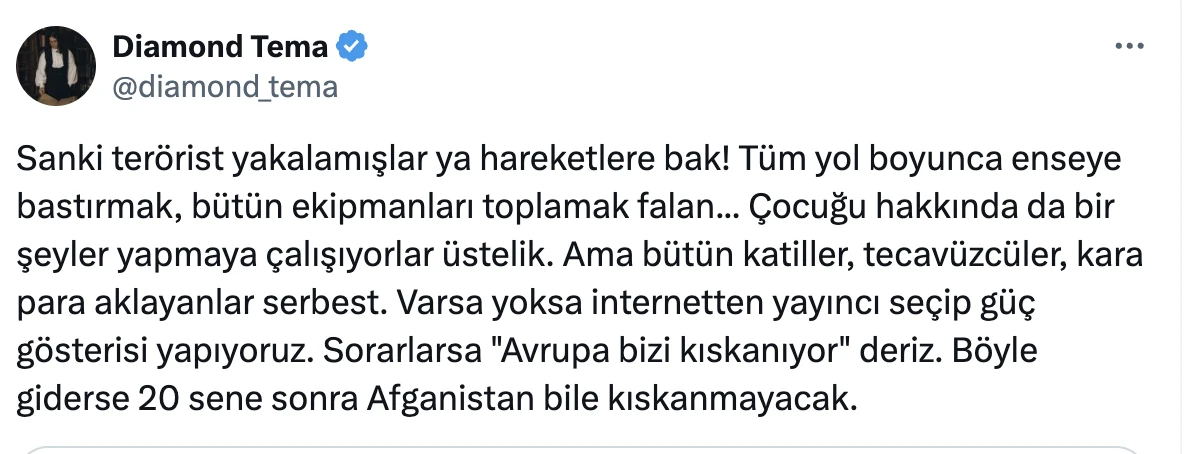 Sosyal medyada, Diamond Tema isimli hesap tarafından yapılan paylaşımda, Jahrein’in tutuklanmasıyla ilgili tepkiler dile getirildi. Paylaşımda, tutuklama işleminin aşırı olduğunu belirten Diamond Tema, “Tüm yol boyunca enseye bastırmak, bütün ekipmanları toplamak falan... Çocuğu hakkında da bir şeyler yapmaya çalışıyorlar. Ama bütün katiller, tecavüzcüler, kara para aklayanlar serbest. İnternet üzerinden yayıncı seçip güç gösterisi yapıyoruz,” ifadelerini kullandı.