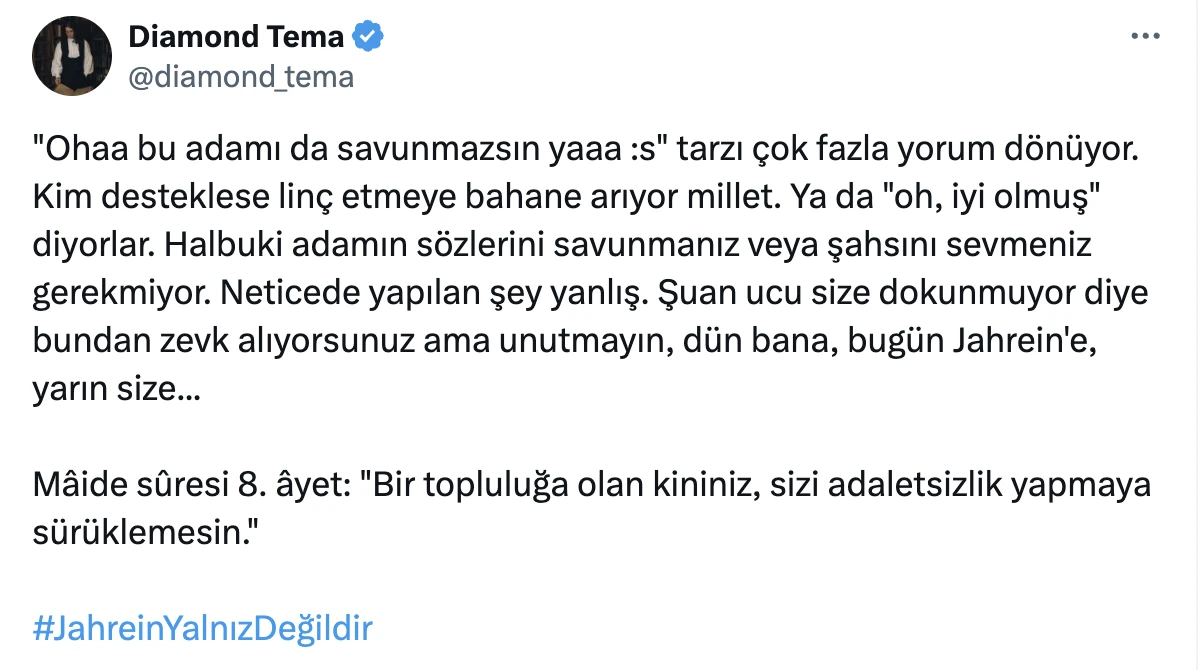 Ayrıca, sosyal medya kullanıcılarının Jahrein’in suçlarını savunup savunmadığını sorguladığı ve bazı kişilerin linç kültürüne başvurduğu belirtilerek, “Neticede yapılan şey yanlış. Şuan ucu size dokunmuyor diye bundan zevk alıyorsunuz ama unutmayın, dün bana, bugün Jahrein’e, yarın size...” uyarısında bulunuldu.