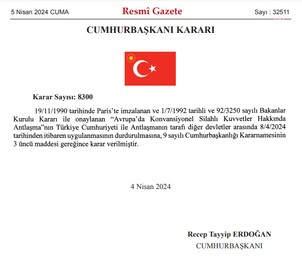 Bugün, Cumhurbaşkanı Recep Tayyip Erdoğan'ın imzasıyla Resmi Gazete'de yayımlanan kararla, Türkiye, 1992 yılında imzalanan NATO ve Varşova Paktı arasındaki Avrupa Konvansiyonel Silahlı Kuvvetler Antlaşması'nı (AKKA) askıya aldığını duyurdu. Bu kararla birlikte, konvansiyonel askeri ekipmanlara yönelik sınırlamalar 8 Nisan 2024 tarihinden itibaren uygulanmayacak.