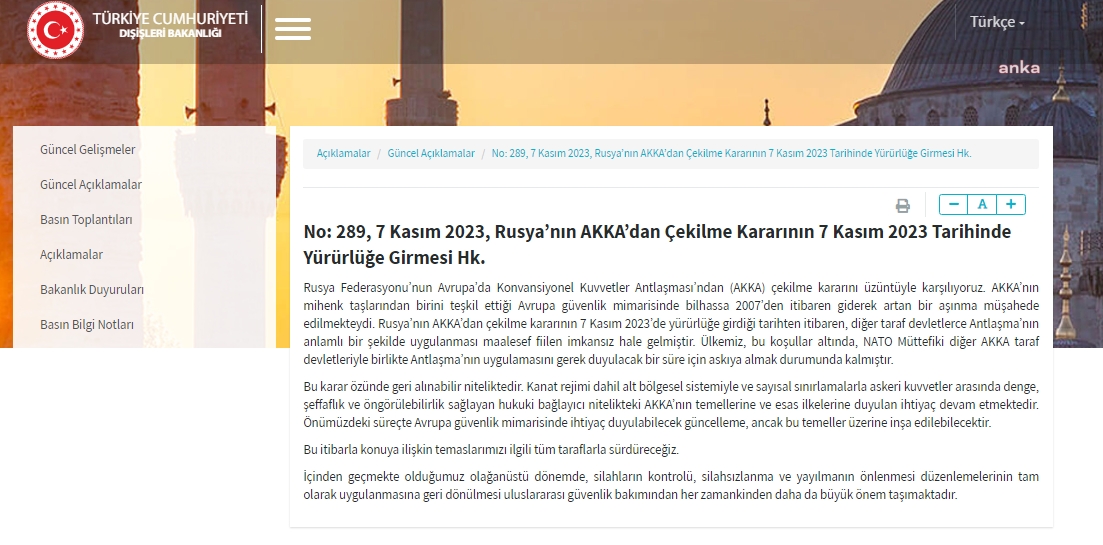 Dışişleri Bakanlığı Sözcüsü Öncü Keçeli, Türkiye'nin AKKA'dan Rusya'nın çekilmesinin ardından NATO Müttefikleriyle birlikte Antlaşma'yı askıya alma kararını değerlendirdi. Keçeli, bu kararın, Antlaşma'nın anlamlı bir şekilde uygulanmasının imkansız hale gelmesi üzerine alındığını belirtti. Ayrıca, bu kararın geri alınabilir nitelikte olduğunu vurguladı.