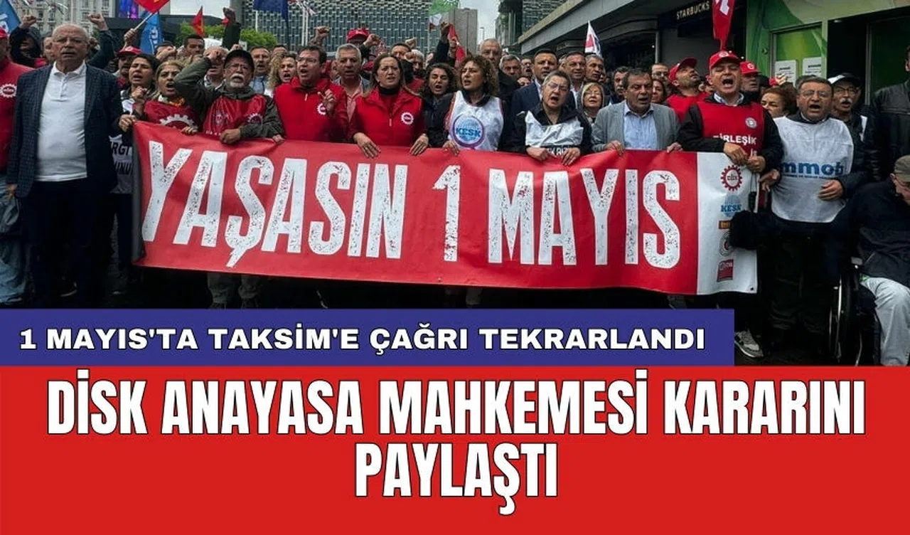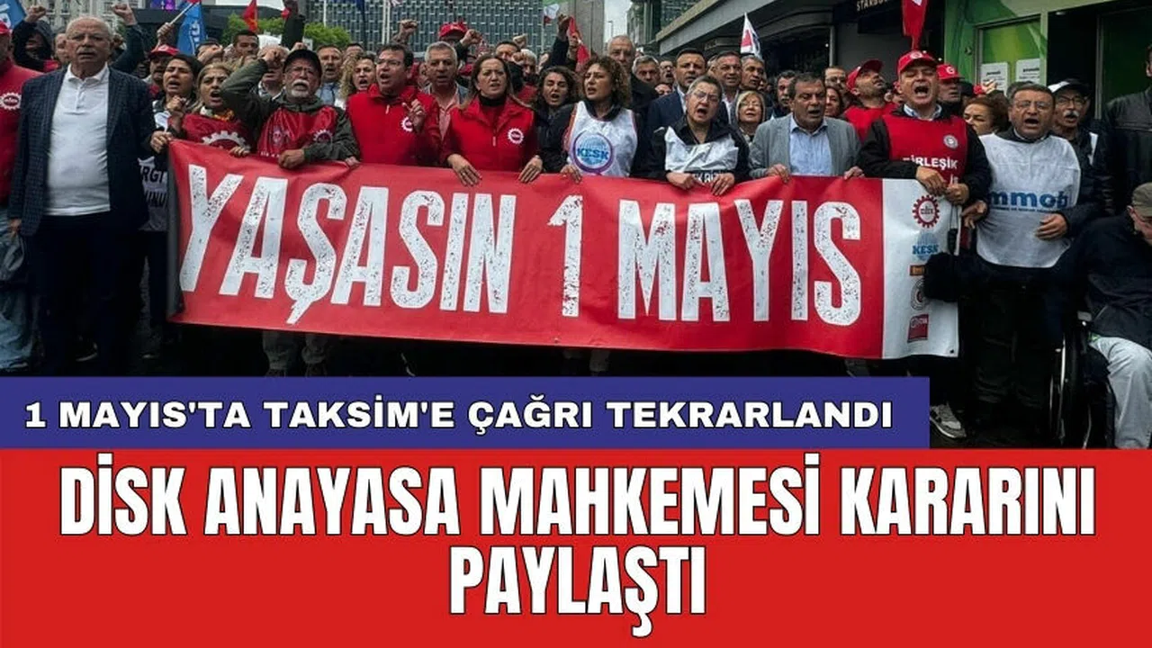 Devrimci İşçi Sendikaları Konfederasyonu (DİSK), Anayasa Mahkemesi'nin (AYM) 12 Ekim 2023 tarihli kararının bir bölümünü resmi sosyal medya hesabından paylaşarak 1 Mayıs'ta Taksim'e çağrısını bir kez daha yineledi. DİSK'in sosyal medya hesabından yapılan paylaşımda, AYM kararında yer alan önemli ifadeler vurgulandı. Kararda, "Kendisini o kültürün bir parçası olarak gören her kişinin 1 Mayıs günlerinde Taksim Meydanı'nın ifade ettiği anlamı doğrudan tecrübe etmek ve edindiği tecrübeyi kuşaklar boyunca aktarmak için orada bulunma hakkı vardır" denildi.