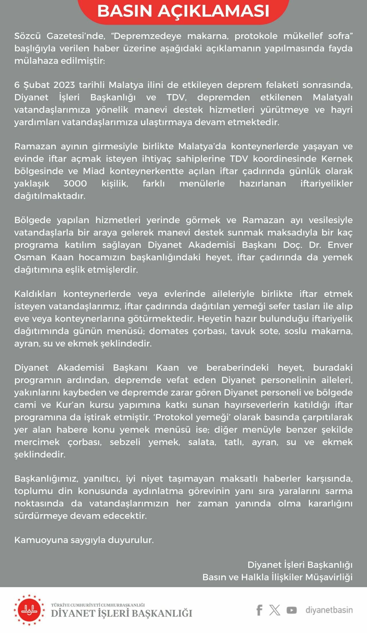 Gazetenin, Diyanet Akademisi Başkanı Enver Kaan ve Malatya Müftüsü Şahin Yıldırım'ın yemek dağıtımının ardından kendileri için özel hazırlanan iftar yemeğini yediği yönündeki iddialara da cevap verildi. Açıklamada, Kaan ve beraberindeki heyetin, depremde vefat eden Diyanet personelinin aileleri, yakınlarını kaybeden ve depremde zarar gören Diyanet personeli ile bölgede cami ve Kur’an kursu yapımına katkı sunan hayırseverlerin katıldığı iftar programına iştirak ettiği ve konu edilen yemeğin, "protokol yemeği" olarak basında çarpıtılarak yer aldığı belirtildi.