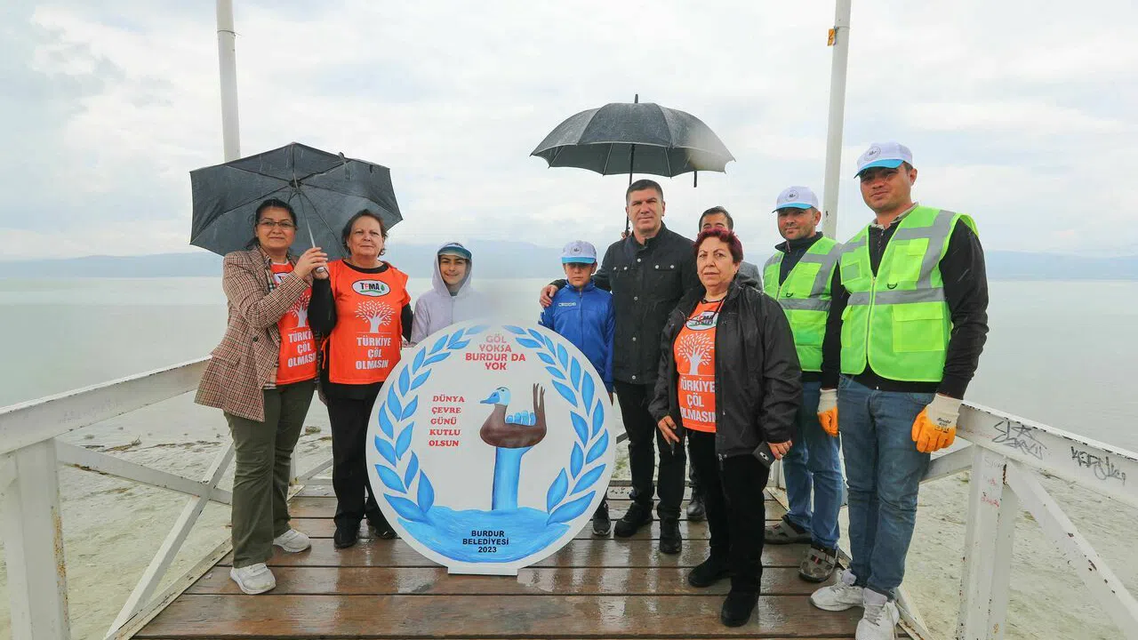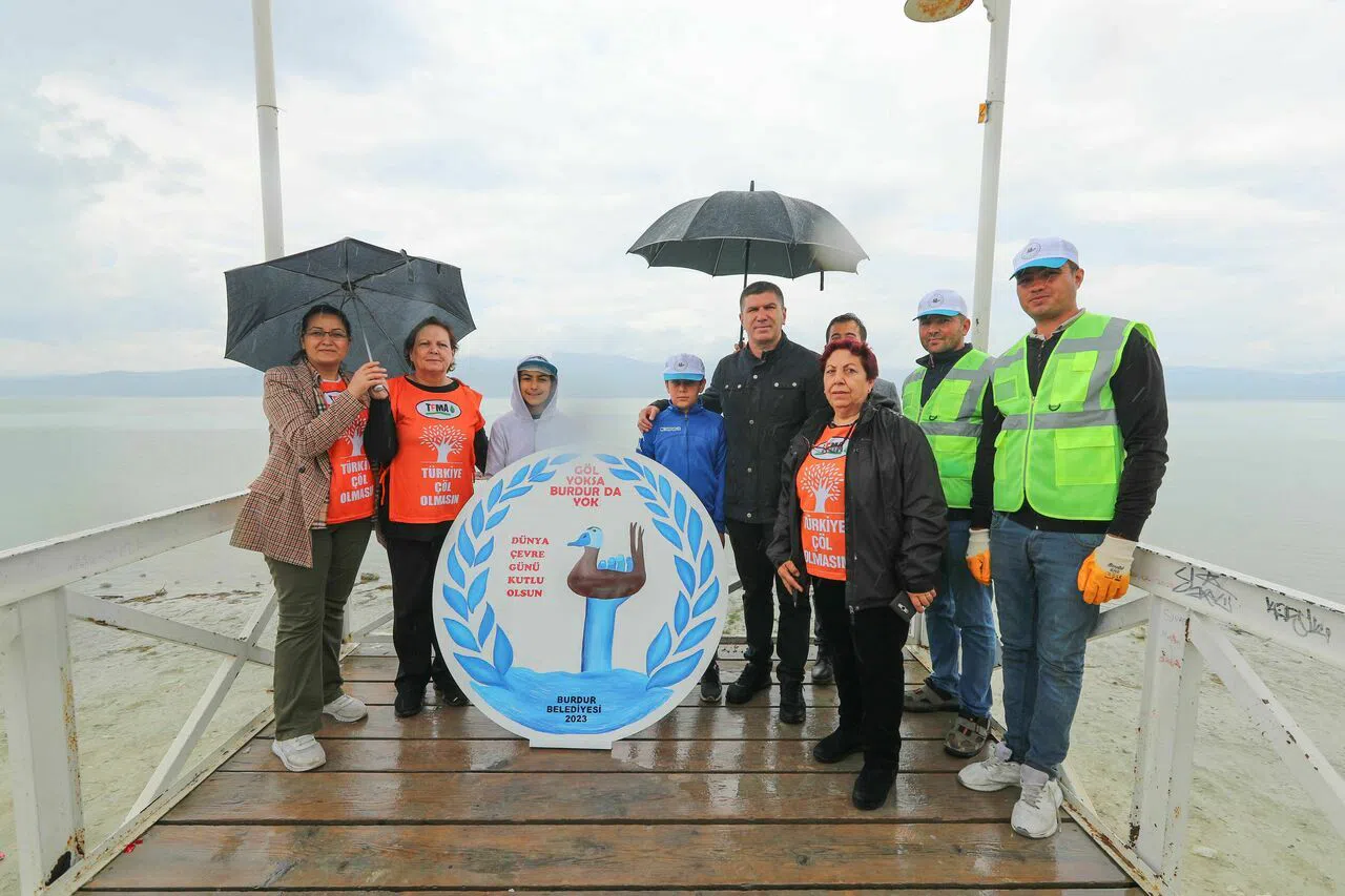 Burdur'da 5 Haziran Dünya Çevre Günü kapsamında kuraklığa dikkat çekmek için Burdur Gölü kıyısında etkinlik düzenlenen etkinlikte iskeleye 'Göl yoksa Burdur da yok' yazan çelenk bırakılırken Cumhuriyet’in 100. yılı olması nedeniyle doğal kökboyası ile boyanmış 100 metrelik örtü ile göl kıyısında '100' rakamı yazıldı.