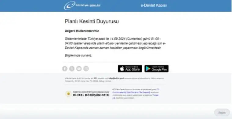 e-Devlet üzerinden gönderilen bilgilendirme mesajında, "Değerli Kullanıcılarımız, sistemlerimizde Türkiye saati ile 14.09.2024 (Cumartesi) günü 01.00-04.00 saatleri arasında planlı altyapı yenileme çalışması yapılacağı için e-Devlet Kapısında zaman zaman kesintiler yaşanması öngörülmektedir. Bilgilerinize sunarız." ifadelerine yer verilmiştir.