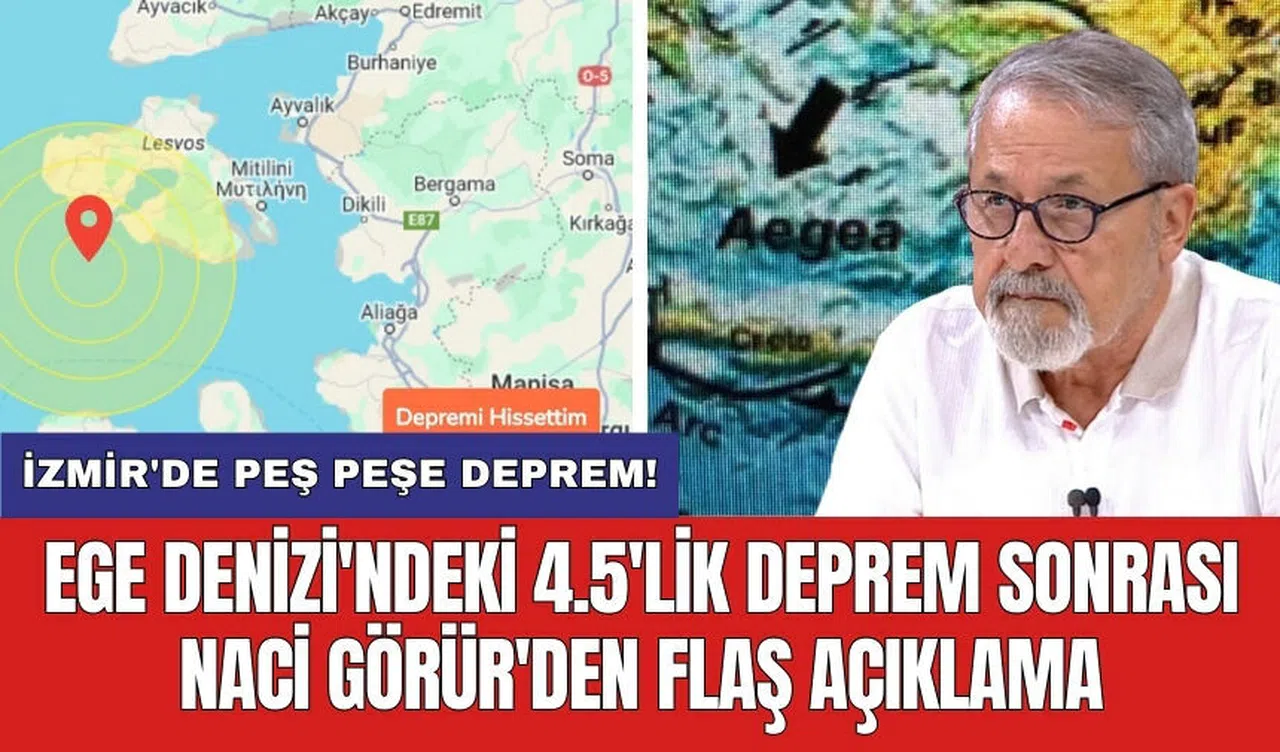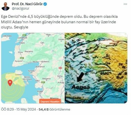 Deprem sonrası Yer Bilimci Prof. Dr. Naci Görür'den açıklama geldi. Sosyal medya hesabından haritalar paylaşan Görür, "Ege Denizi’nde 4,5 büyüklüğünde deprem oldu. Bu deprem olasılkla Midilli Adası’nın hemen güneyinde bulunan normal bir fay üzerinde oluştu. Sevgiyle" ifadelerini kullandı.