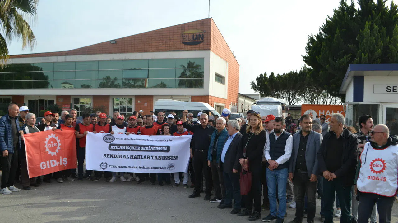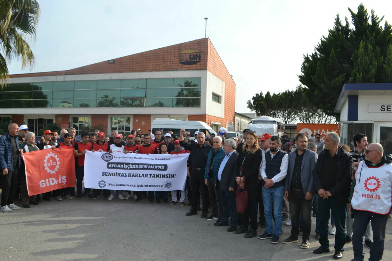 Unmaş Unlu Mamulleri Anonim Şirketi’nin çalıştırdığı Antalya ekmek fabrikasında çalışan 130 işçinin Öz Gıda-İş Sendikası’ndan ayrılarak DİSK Gıda-İş Sendikası’na geçmesi sonrasında mobbinge uğraması ve 11 işçinin işten atılması direnişi başlattı. Durumu fabrika önünde protesto eden işçiler ve sendika yöneticileri taleplerini aktardı. Basın açıklamasını okuyan DİSK Yönetim Kurulu Üyesi ve Gıda-İş Genel Başkanı Seyit Aslan, “Patronların yanında değil, işçilerin yanında olun. Bir kez daha belirtmek isterim ki mücadelemiz devam edecektir, Uno işçisi yalnız kalmayacaktır” dedi.