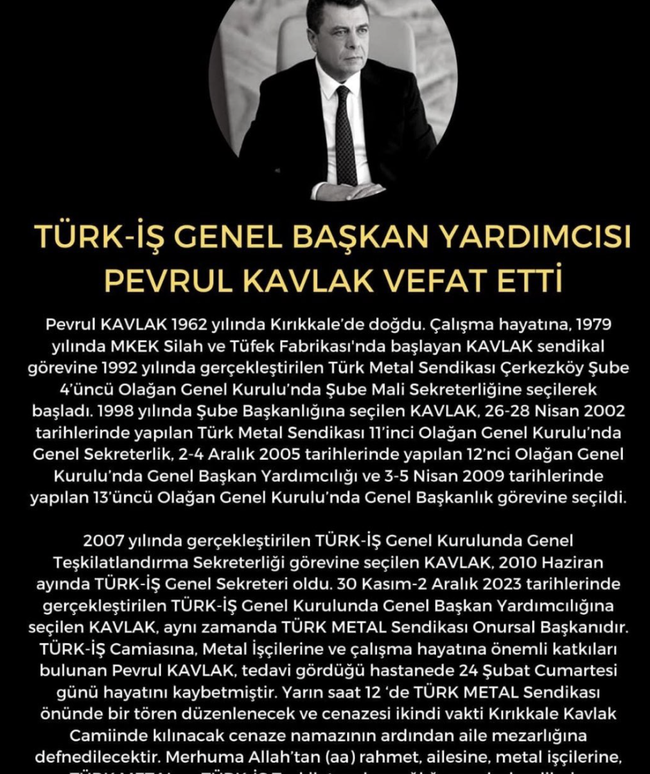 Ankara'daki bir hastanede kanser tedavisi gören Pevrul Kavlak, yaşamını yitirdi. Türk Metal Sendikası'nın onursal genel başkanı olan Kavlak'ın cenazesi, yarın saat 12.00'de Türk Metal Sendikası binası önünde düzenlenecek törenin ardından memleketi Kırıkkale'de defnedilecek.