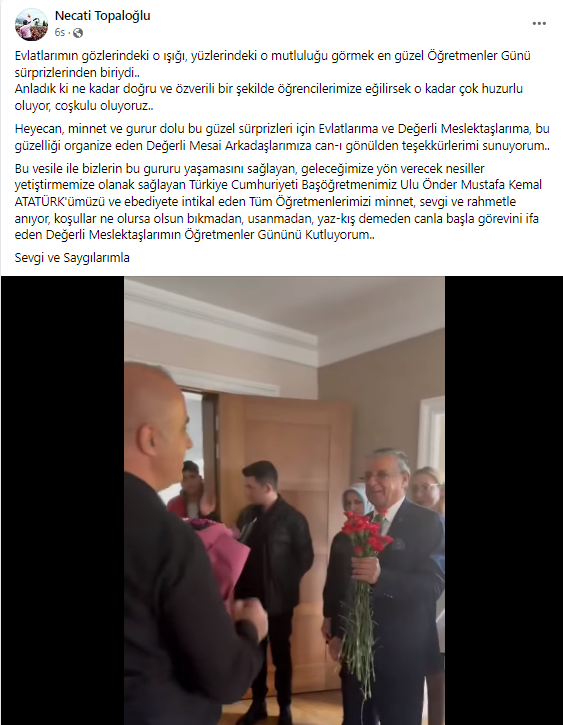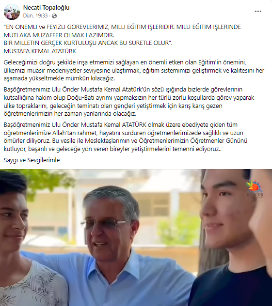 Kemer Belediye Başkanı emekli öğretmen Necati Topaloğlu, sosyal medyada Öğretmenler Günü'ne özel duygulandıran mesaj paylaştı.