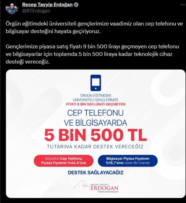 Erdoğan, “Gençlerimize piyasa satış fiyatı 9 bin 500 lirayı geçmeyen cep telefonu ve bilgisayarlar için toplamda 5 bin 500 liraya kadar teknolojik cihaz desteği vereceğiz.” diye ifade etti.
