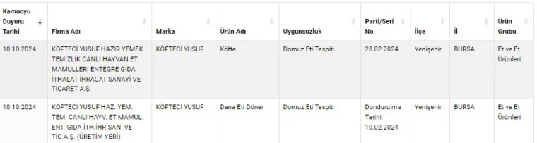 Gelişmenin ardından Tarım ve Orman Bakanlığı'nın Güvenilir Gıda sitesindeki Sağlığı Tehlikeye Düşürecek Gıdalar listesine Köfteci Yusuf ürünleri de eklendi. Bakanlık tarafından 10 Ekim 2024 tarihinde yapılan açıklamada, Köfteci Yusuf markasına ait iki üründe domuz eti tespit edildiği belirtildi. 28 Şubat 2024 tarihli partiye ait köfte ürününde domuz eti tespit edildi. Üretim yeri Bursa'nın Yenişehir ilçesi olarak kaydedildi. 10 Şubat 2024 tarihinde dondurulmuş dana eti dönerde de domuz eti bulundu. Bu ürün de aynı şekilde Bursa'nın Yenişehir ilçesindeki üretim yerinde hazırlandı.