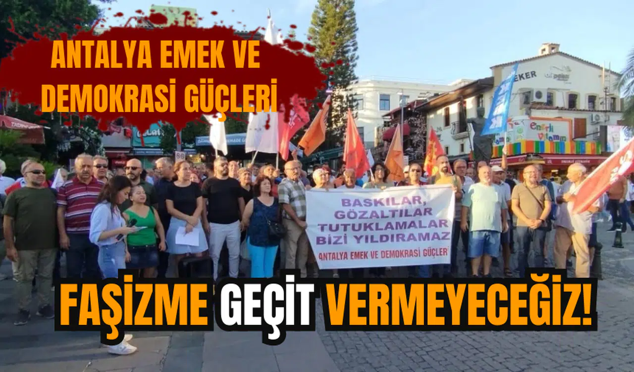Antalya Emek ve Demokrasi Güçleri adına basın açıklamasını okuyan Eğitim-Sen Şube Sekreteri Güneş Atsız, “Bugün gözaltılar arasında Eğitim Sen Antalya Şube Başkanı Nurettin Sönmez, Örgütlenme Sekreteri Çiğdem Altıntaş Peker ,üyeleri Kadir Öztürk,Hasan Taşkın ,Yaşar Sarıpınar, , DİSK-EMEKLİ SEN üyesi Ömer Güreli , Emek Partisi Antalya İl başkanı Hasan Alkan ,üyesi Mahir Doğan, SOL Parti İl yöneticileri Sabri Kırdar, Öykü Ağtaş, TİP İl yöneticisi Enes Keskin, Eylem Karaman, Kepez İlçe Yöneticileri Ahmet İzci, Haluk Kurt,Nehir Erdoğan,Serhat Nejat Çelik, , Halkevi yöneticisi Adem Palalı,üyeleri Digde Simay Perev,Halk Der yönetici Hasan Özseçen ve Derya Dinç, Yeliz Teke, ile birlikte toplam 21 kişi gözaltın alınmıştır” dedi.