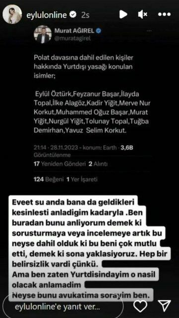Öztürk, 'Evet, şu anda bana geldikleri kesinleşti anladığım kadarıyla. Ben buradan bunu anlıyorum. Demek ki soruşturmaya veya incelemeye dahil olduk. Bu beni çok mutlu etti. Demek ki sona yaklaşıyoruz. Hep bir belirsizlik vardı. Ama ben zaten yurt dışındayım, o nasıl olacak anlamadım. Neyse bunu avukatıma sorayım' ifadelerini kullandı.