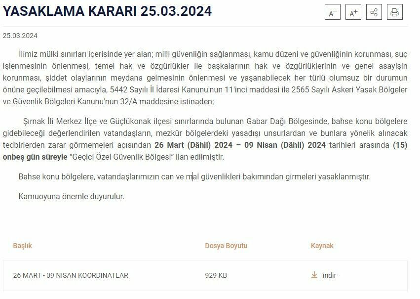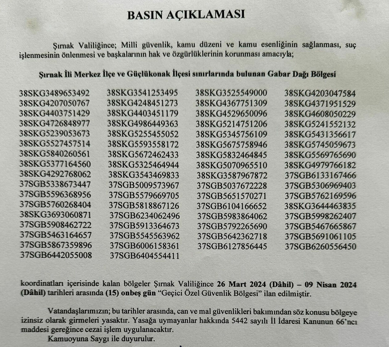 Şırnak İli Merkez İlçe ve Güçlükonak ilçesi sınırlarında bulunan Gabar Dağı Bölgesinde, bahse konu bölgelere gidebileceği değerlendirilen vatandaşların, mezkûr bölgelerdeki yasadışı unsurlardan ve bunlara yönelik alınacak tedbirlerden zarar görmemeleri açısından 26 Mart (Dâhil) 2024 – 09 Nisan (Dâhil) 2024 tarihleri arasında (15) onbeş gün süreyle “Geçici Özel Güvenlik Bölgesi” ilan edilmiştir.