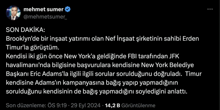 "SON DAKİKA: Brooklyn'de bir inşaat yatırımı olan Nef İnşaat şirketinin sahibi Erden Timur'la görüştüm. Kendisi iki gün önce New York'a geldiğinde FBI tarafından JFK havalimanıı'nda bilgisine başvurulara kendisine New York Belediye Başkanı Eric Adams'la ilgili ilgili sorular sorulduğunu doğruladı. Timur kendisine Adams'ın kampanyasına bağış yapıp yapmadığının sorulduğunu kendisinin de bağış yapmadığını soyledigini anlattı."