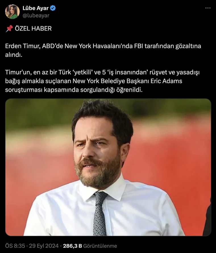 "ÖZEL HABER Erden Timur, ABD’de New York Havaalanı'nda FBI tarafından gözaltına alındı. Timur'un, en az bir Türk ‘yetkili’ ve 5 ‘iş insanından’ rüşvet ve yasadışı bağış almakla suçlanan New York Belediye Başkanı Eric Adams soruşturması kapsamında sorgulandığı öğrenildi."