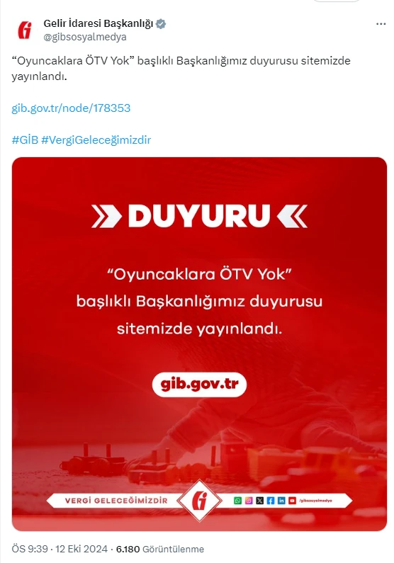 Gelir İdaresi Başkanlığı (GİB), sosyal medyada ve bazı basın organlarında yer alan oyuncaklardan Özel Tüketim Vergisi (ÖTV) alınacağı yönündeki iddiaların gerçeği yansıtmadığını açıkladı. Özellikle üç tekerlekli bisikletler, oyuncak bebekler, pedallı arabalar gibi oyuncakların ÖTV kapsamına alınacağı söylentileri, GİB tarafından yapılan açıklamayla netlik kazandı.