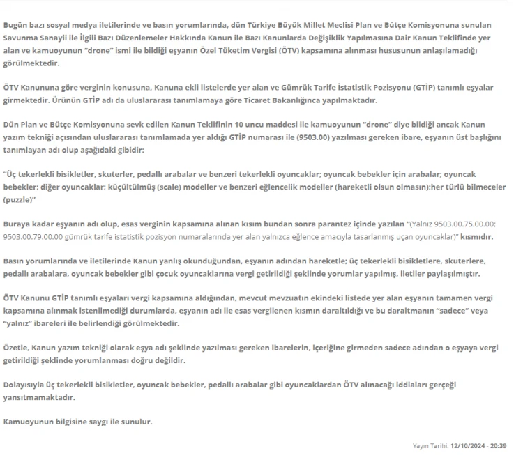 GİB'in internet sitesinde yapılan açıklamada, ‘’Dün Plan ve Bütçe Komisyonuna sevk edilen kanun teklifinin 10. maddesi ile kamuoyunun 'drone' diye bildiği ancak Kanun yazım tekniği açısından uluslararası tanımlamada yer aldığı GTİP numarası ile (9503.00) yazılması gereken ibare, eşyanın üst başlığını tanımlayan adı olup aşağıdaki gibidir: