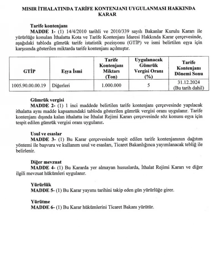 Resmî Gazete'de yayımlanan "Mısır İthalatında Tarife Kontenjanı Uygulanması Hakkında Karar" başlıklı belgede, ithalat süreciyle ilgili detaylı bilgiler verildi. Karar çerçevesinde, tarife kontenjanı için belirlenen gümrük vergisi oranları ve usul ve esaslar aşağıdaki gibi düzenlenmiştir: