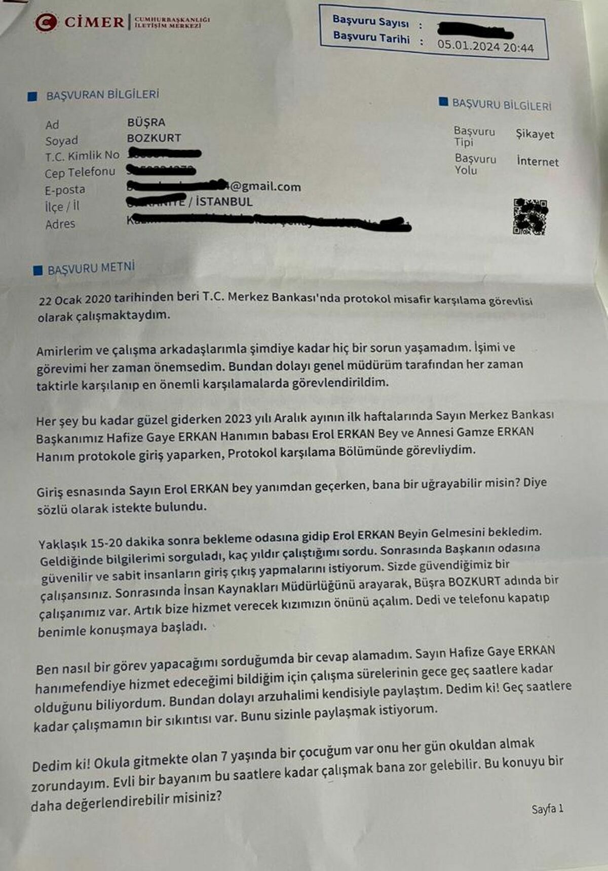 Dört yıldır Merkez Bankası başkanlık katında protokol görevlisi olarak çalışan Bozkurt, CİMER'e sunduğu dilekçesinde, "Başkanımız Hafize Gaye Erkan Hanım’ın babası Erol Erkan Bey ve annesi Gamze Hanım protokole giriş yaparken, Erol Bey yanımdan geçerken, ‘bana bir uğrayabilir misin?’ dedi. Ziyaret sonrasında, ‘Başkanın odasına güvenilir ve sabit insanların giriş çıkış yapmalarını istiyorum. Siz de güvendiğimiz bir çalışansınız’ diyerek beni İnsan Kaynakları’na yönlendirdi ve çalışma yerimi değiştirdi" ifadelerini kullandı.