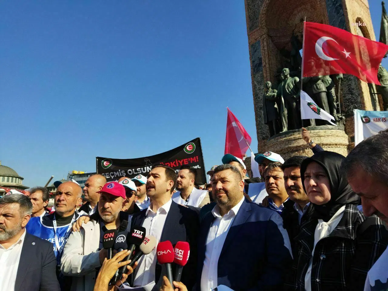Hak İşçi Sendikaları Konfederasyonu (HAK-İŞ) Başkanı Mahmut Arslan ve beraberindeki heyet, 1 Mayıs Emek ve Dayanışma Günü dolayısıyla Taksim'deki Cumhuriyet Anıtı'na çelenk bıraktı. Arslan, "Milli gelirden, ekonomik büyümeden ve refah artışından hak ettiğimiz payı almak istiyoruz. Vergi oranlarının düzenlenmesini, kriz sürecinde tüm ücretlilerden alınan vergi oranının yüzde 10 olarak belirlenmesini talep ediyoruz" dedi.