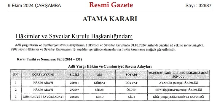 9 Ekim 2024 tarihinde Resmi Gazete'de yayımlanan Hâkimler ve Savcılar Kurulu (HSK) kararı ile 2 hakim ve 1 savcı ataması gerçekleştirildi. Ad çekme usulüyle yapılan atamalarda, yeni görev yerlerine atanan isimler belli oldu.