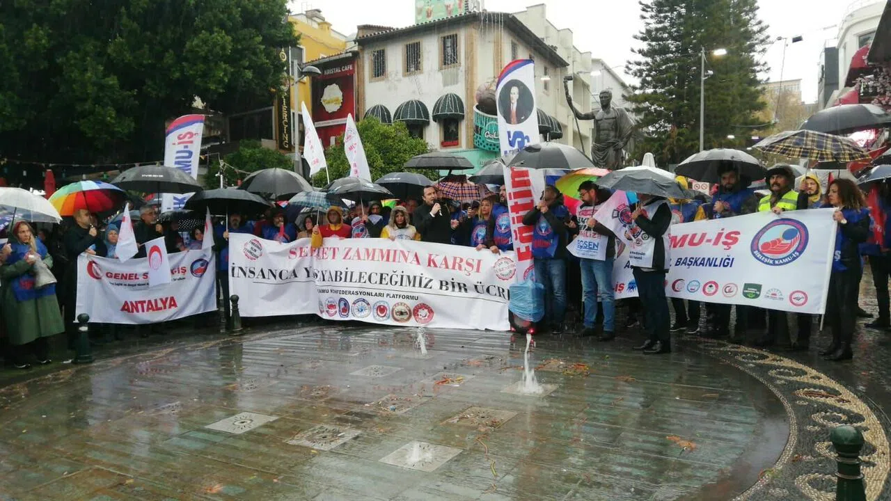 Sendika Antalya Şube Başkanı Başkan Sadık Acar ise “Hepinizin bildiği gibi asgari ücret geçtiğimiz günlerde 8500 TL olarak açıklanmıştır. Ülkenin bu ekonomik şartlarında asgari ücretin alım gücü açısından yüksek olmadığını hepimiz bilmekteyiz. Asgari ücrete yapılan artış sonrası ortalama memur maaşlarına baktığımızda, asgari ücret ile memur maaşlarının neredeyse eşitlendiğini görmekteyiz. 2010 yılında asgari ücret 576 TL iken, ortalama memur maaşı asgari ücretin 3 katıydı. Günümüzde ise yeni açıklanan asgari ücret ile ortalama memur maaşları eşit seviyeye gelmiş, emeklilerin ücretleri ise asgari ücretin dahi altında kalmıştır. 2002 yılında en düşük emekli aylığı asgari ücretin 53 Türk lirası üzerindeyken, yapılan son zamlarla birlikte asgari ücret en düşük emekli aylığının 3 bin Türk lirası üzerine çıkmıştır. Sorun asgari ücretin çok artırılması değil, kamu çalışanları ve emeklilerinin ücretlerinin komik ve acınacak artışlara maruz kalmasıdır. Cumhurbaşkanı’nın önce yüzde 25 olarak açıkladığı sonra danışıklı bir şekilde yandaş sendikanın talebiymiş gibi önceden belirlenmiş yüzde 30 oranı bahşiş dağıtır gibi kamu çalışanlarına müjde olarak sunulmuştur. Yandaş sendikalar her ne kadar ülke şartlarını ve ekonomik krizi görmezden gelip her toplu sözleşme döneminde kamu çalışanlarını masada sattığı gibi bugün yine kuruluş amaçlarına göre hareket ederek verilen bu bahşişi ayakta alkışlamıştır” dedi.