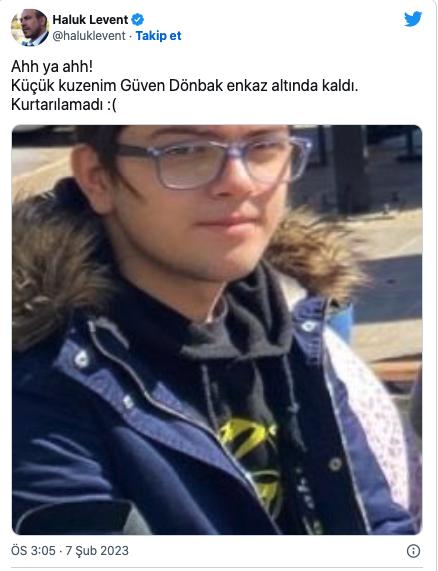 Sanatçı ve AHBAP Platformu Başkanı Haluk Levent ekibiyle beraber Türkiye’nin yarasını sararken bir acı haberde ondan geldi. Sosyal medya üzerinden enkaz altında kalan kuzenini kaybettiğini açıklayan Haluk Levent “Ahh ya ahh! Küçük kuzenim Güven Dönbak enkaz altında kaldı. Kurtarılamadı” dedi.