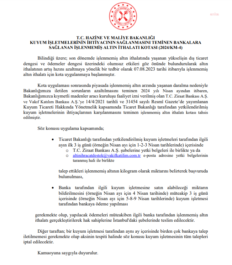 Bakanlığın internet sitesinden yapılan açıklamaya göre, 7 Ağustos 2023 tarihi itibarıyla işlenmemiş altın ithalatı için kota uygulanmaya başlandı. Bu karar, dış ticaret dengesi ve ödemeler dengesi üzerindeki etkilerin azaltılmasını amaçlıyor.
