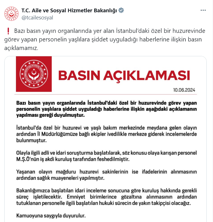 Bakanlık, bazı basın yayın organlarında yer alan İstanbul'daki özel bir huzurevinde görev yapan personelin yaşlılara şiddet uyguladığı haberleri üzerine, kamuoyunu bilgilendirmek amacıyla açıklama yapılması gereğini duyurdu.