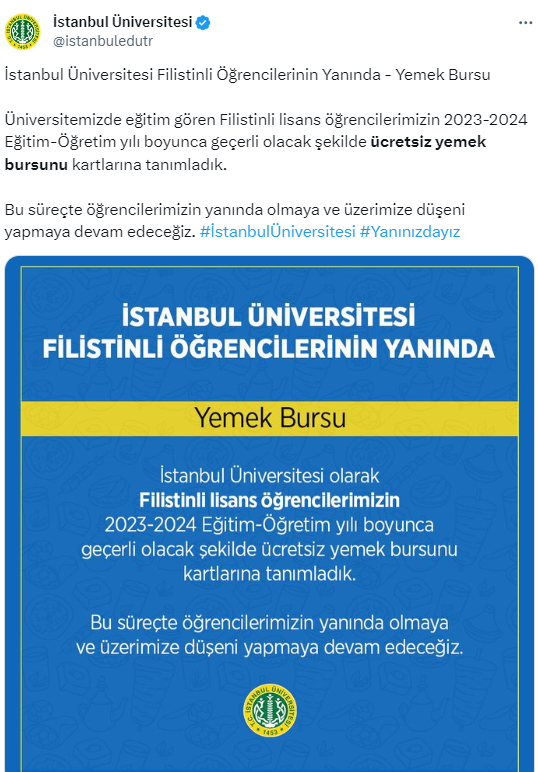 İstanbul Üniversitesi, 2023-2024 akademik yılında Filistinli öğrencilerine yemek bedeli talep etmeyeceğini açıkladı. Üniversite, sosyal medya hesabından yaptığı açıklamada, Filistinli lisans öğrencilerine 2023-2024 öğretim yılı süresince yemek bursu sağlayacağını belirtti.