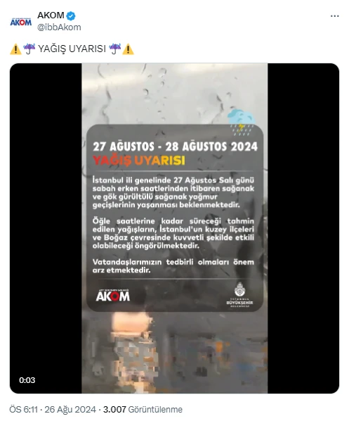 AKOM’un açıklamasına göre, 27 Ağustos Salı günü sabah 07.00 itibarıyla sağanak ve gök gürültülü sağanak yağışların İstanbul’un kuzey ilçeleri ve Boğaz çevresinde kuvvetli şekilde (15-30 kg/m) etkili olması bekleniyor. Yağışların öğle saatlerine kadar (12.00) devam edeceği tahmin ediliyor.