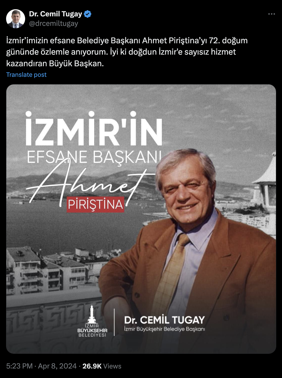 CHP İzmir Büyükşehir Belediyesi Başkanı Cemil Tugay sosyal medyadan yaptığı açıklamada, "İzmir’imizin efsane Belediye Başkanı Ahmet Piriştina’yı 72. doğum gününde özlemle anıyorum. İyi ki doğdun İzmir'e sayısız hizmet kazandıran Büyük Başkan." ifadelerini kullandı.