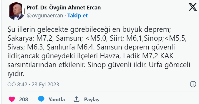 “Şu illerin gelecekte görebileceği en büyük deprem; Sakarya; M7,2, Samsun;