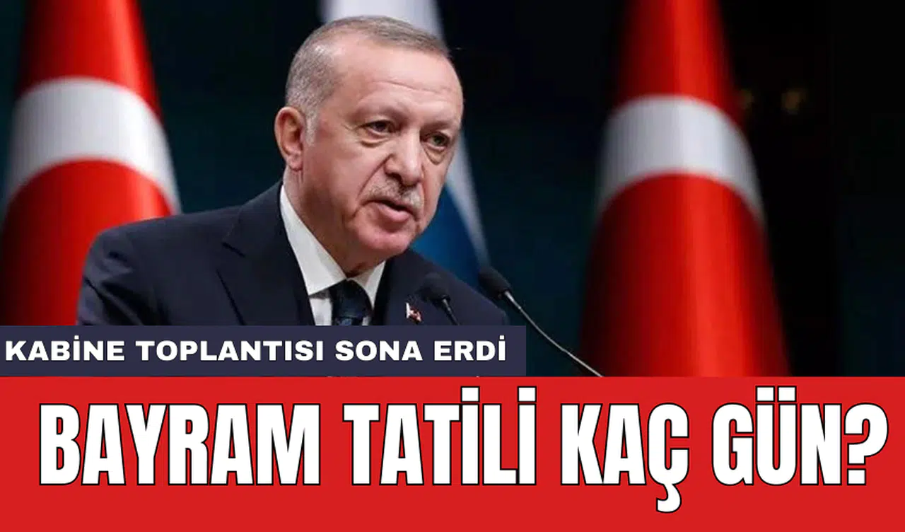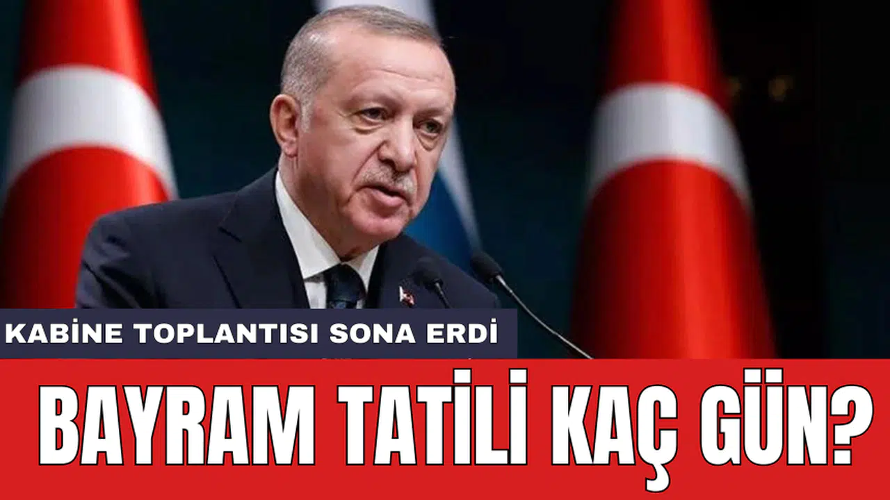 Kabinede Kurban Bayramı tatili süresinin 9 güne uzatılması değerlendirildi. Erdoğan, ' Kamu çalışanlarımız için 16 Haziran Pazar günü başlayacak Kurban Bayramı sonrasındaki 2 günlük süreyi de idari izin kapsamına aldık. Böylelikle Perşembe ve Cuma günlerini de bayram tatiline ekleyerek 9 günlük bir tatil imkânı sağlamış oluyoruz. Kurban Bayramı'nın şimdiden milletimiz, İslam dünyası ve tüm insanlık için hayırlara vesile olmasını diliyorum' dedi.
