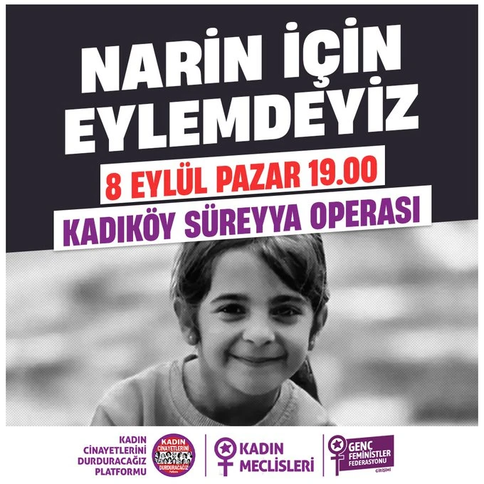 Platformun paylaşımında şu ifadeler yer aldı: "Narin için eylemdeyiz! 19 gün sonra öldürülmüş olarak bulunan Narin için bu akşam 19:00’da Kadıköy Süreyya Operası önünde buluşuyoruz." Bu çağrıyla birlikte, toplumun Narin’in ölümü karşısında duyduğu derin üzüntü ve adalet talebi vurgulandı.