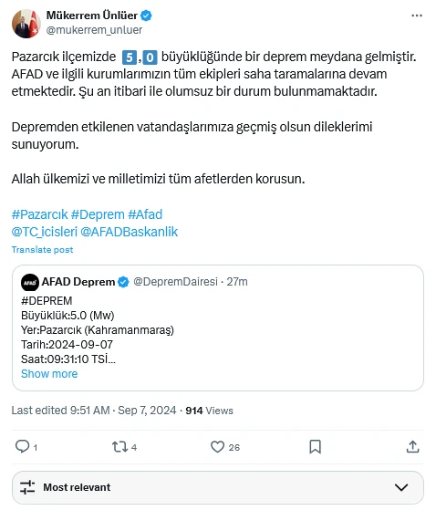 Kahramanmaraş'ta meydana gelen 5.0 büyüklüğündeki deprem sonrası, Vali Mükerrem Ünlüer, kentte herhangi bir olumsuz durumun olmadığını duyurdu. Tüm ekiplerin saha çalışmalarına devam ettiği belirtildi.